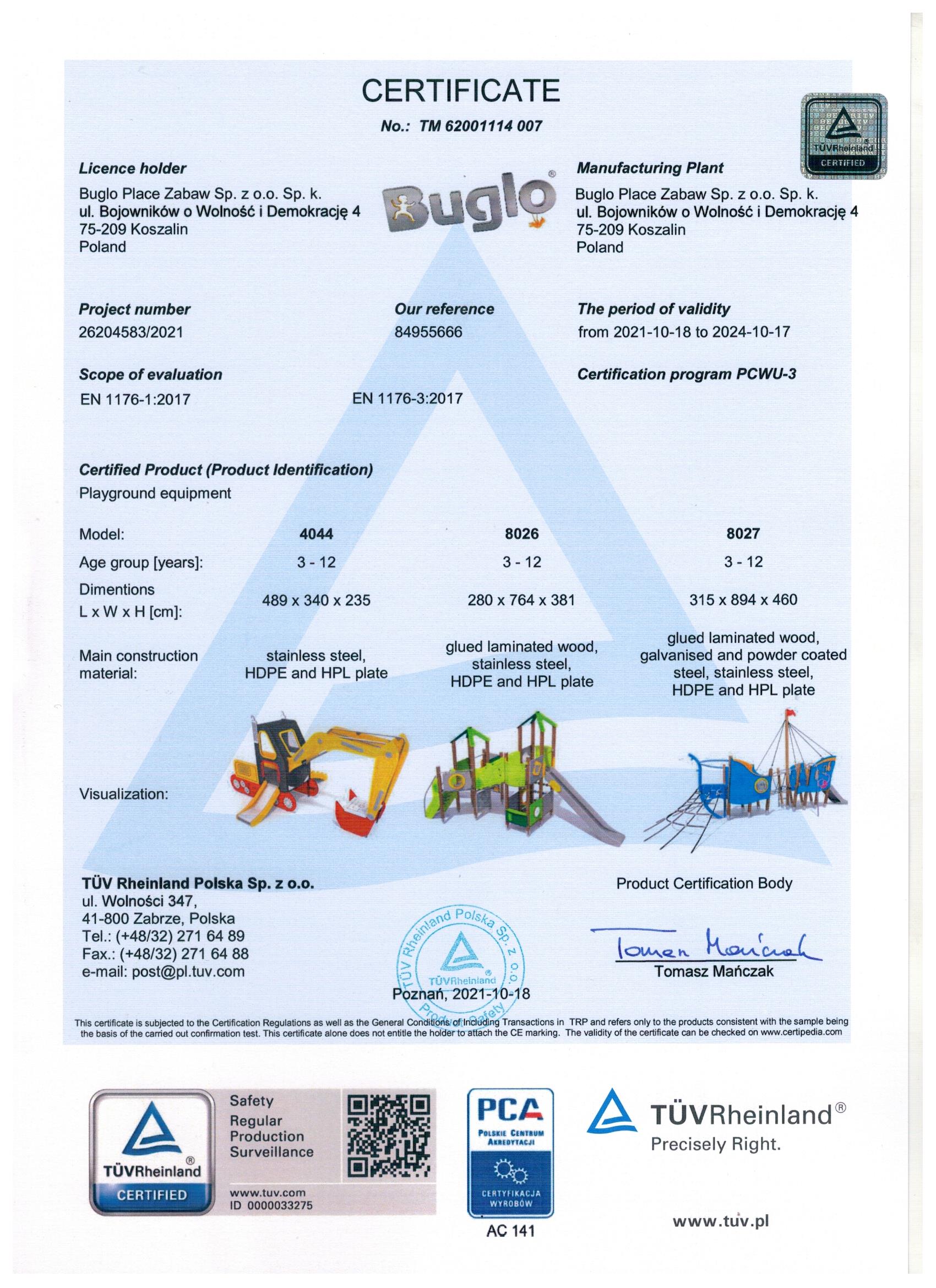 Toate echipamentele de recreere și de joacă trebuie să dețină certificate de conformitate cu seria de standarde EN 1176 – Echipamente și suprafețe pentru spații de joacă, (în cazul echipamentelor de fitness și street workout, standardul este EN 16630:2015).
