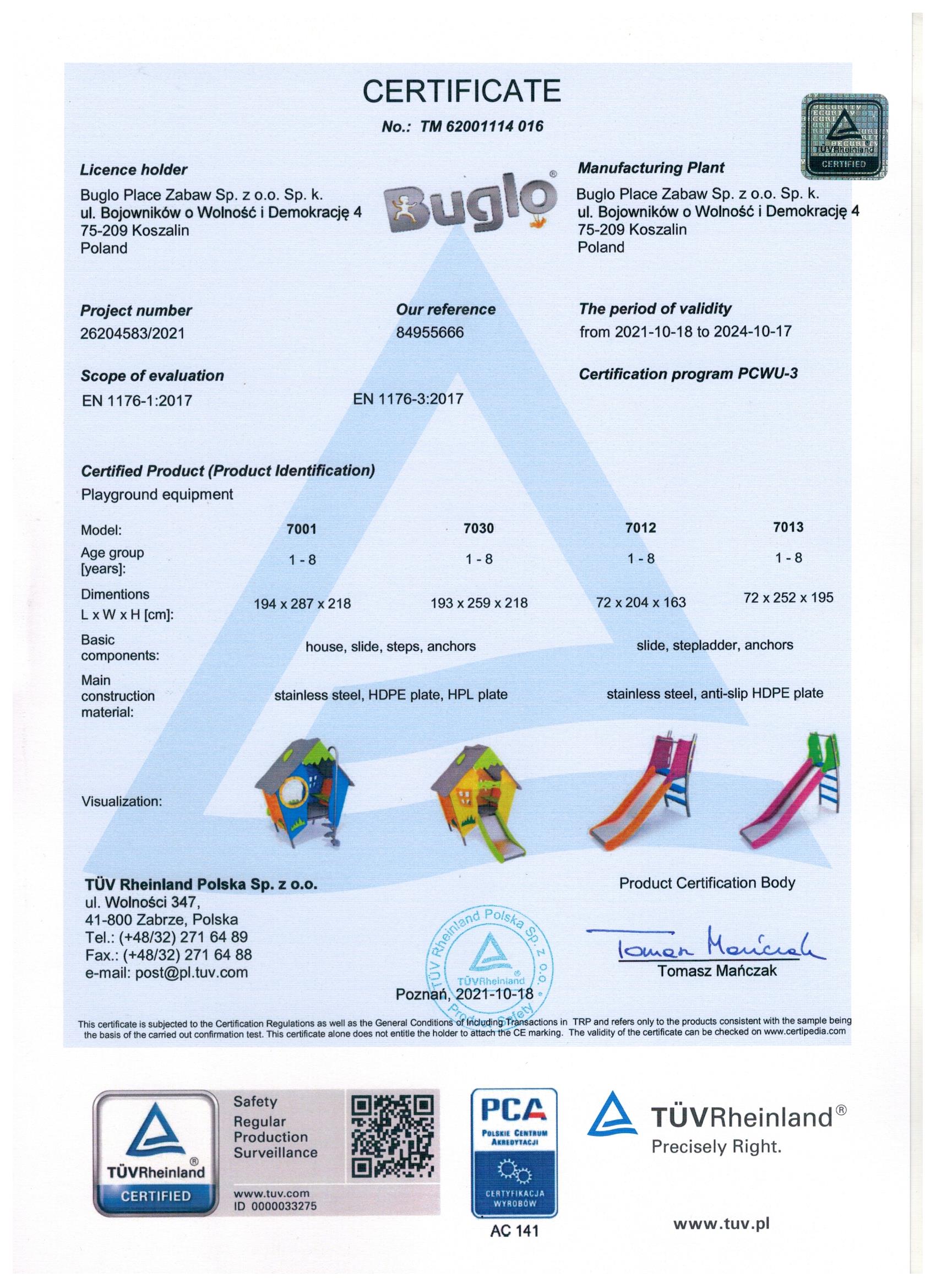Toate echipamentele de recreere și de joacă trebuie să dețină certificate de conformitate cu seria de standarde EN 1176 – Echipamente și suprafețe pentru spații de joacă, (în cazul echipamentelor de fitness și street workout, standardul este EN 16630:2015).