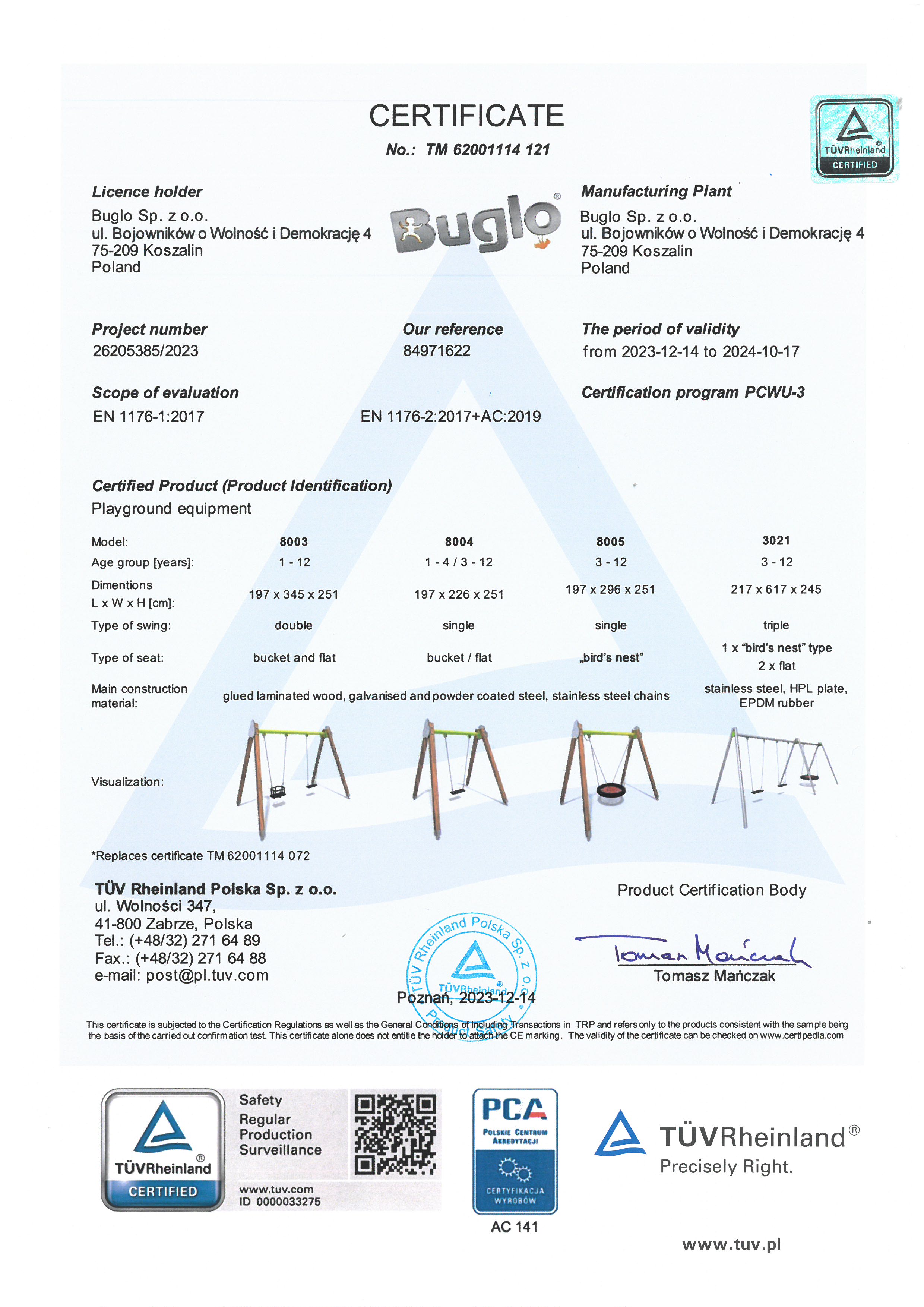 Toate echipamentele de recreere și de joacă trebuie să dețină certificate de conformitate cu seria de standarde EN 1176 – Echipamente și suprafețe pentru spații de joacă, (în cazul echipamentelor de fitness și street workout, standardul este EN 16630:2015).