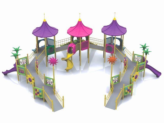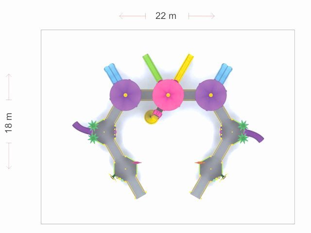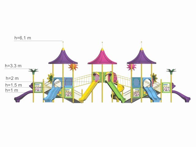 | Descriere: | Ansamblu de joacă cu trei turnuri centrale de formă hexagonală cu acoperiș, două puncte de observare și două turnuri laterale descoperite, cu șapte tobogane, două duble, două clasice, două curbate și unul spiralat, cu jocuri tematice, decorat cu floricele și palmieri. | ||||||||||||||||||||